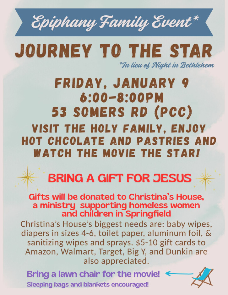 6:00 pm - 8:00 pm ~ JOURNEY TO THE STAR - In Lieu of Night in Bethlehem ~ An Epiphany Celebration at the Parish Community Center